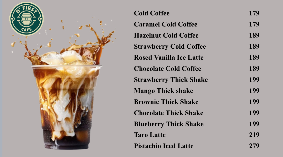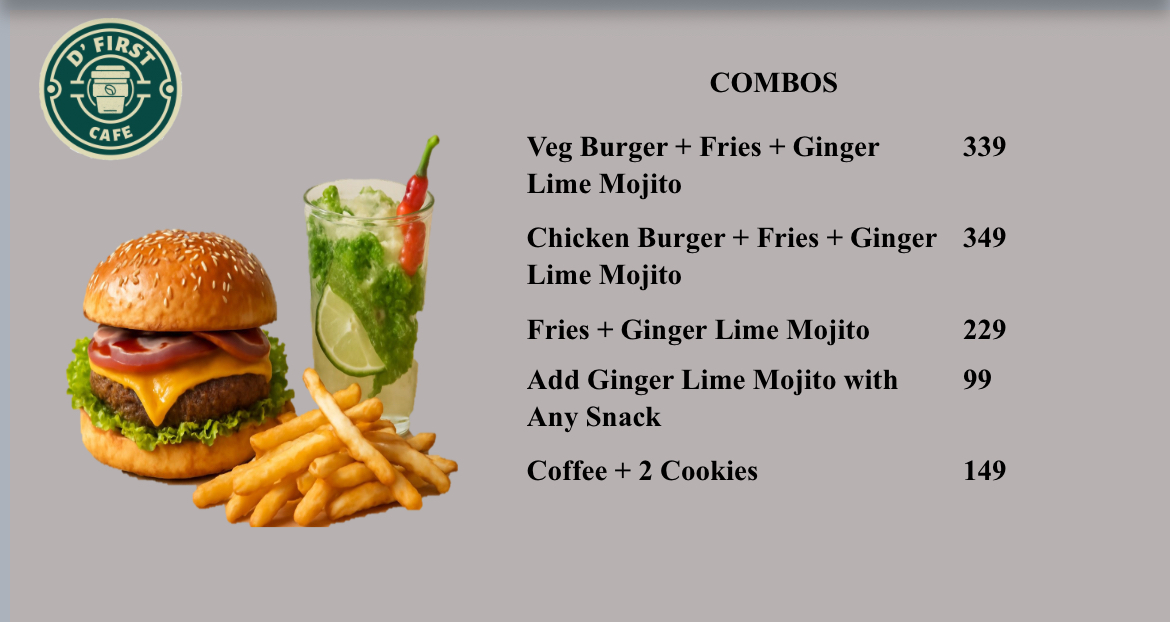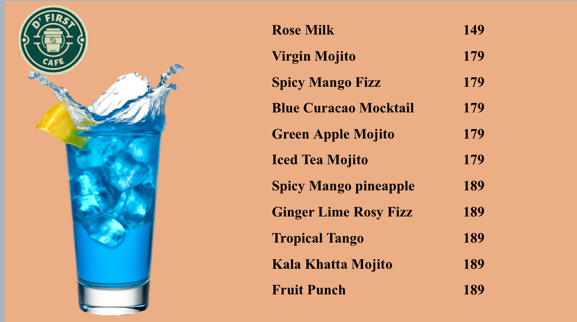 Welcome to D' FIRST CAFE, a charming spot located in the heart of Hyderabad, perfect for a relaxing meal or casual catch-up. This cozy cafe boasts a diverse menu that caters to every palate, featuring refreshing drinks like Rose Milk and vibrant Virgin Mojito. For those craving something more substantial, their quick bites and combos, such as the flavorful Veg Burger paired with aromatic ginger lime mojito, offer great value. Customers rave about the rich, medium-roasted coffee options, which are made to perfection. Additionally, the unique chocolate bar crafted fresh on order is a must-try! As you unwind in this inviting ambiance with board games on hand, indulge in crispy French fries or delightful cookies that elevate the overall experience. D' FIRST CAFE is not just about food; it's an oasis for relaxation and good conversations.